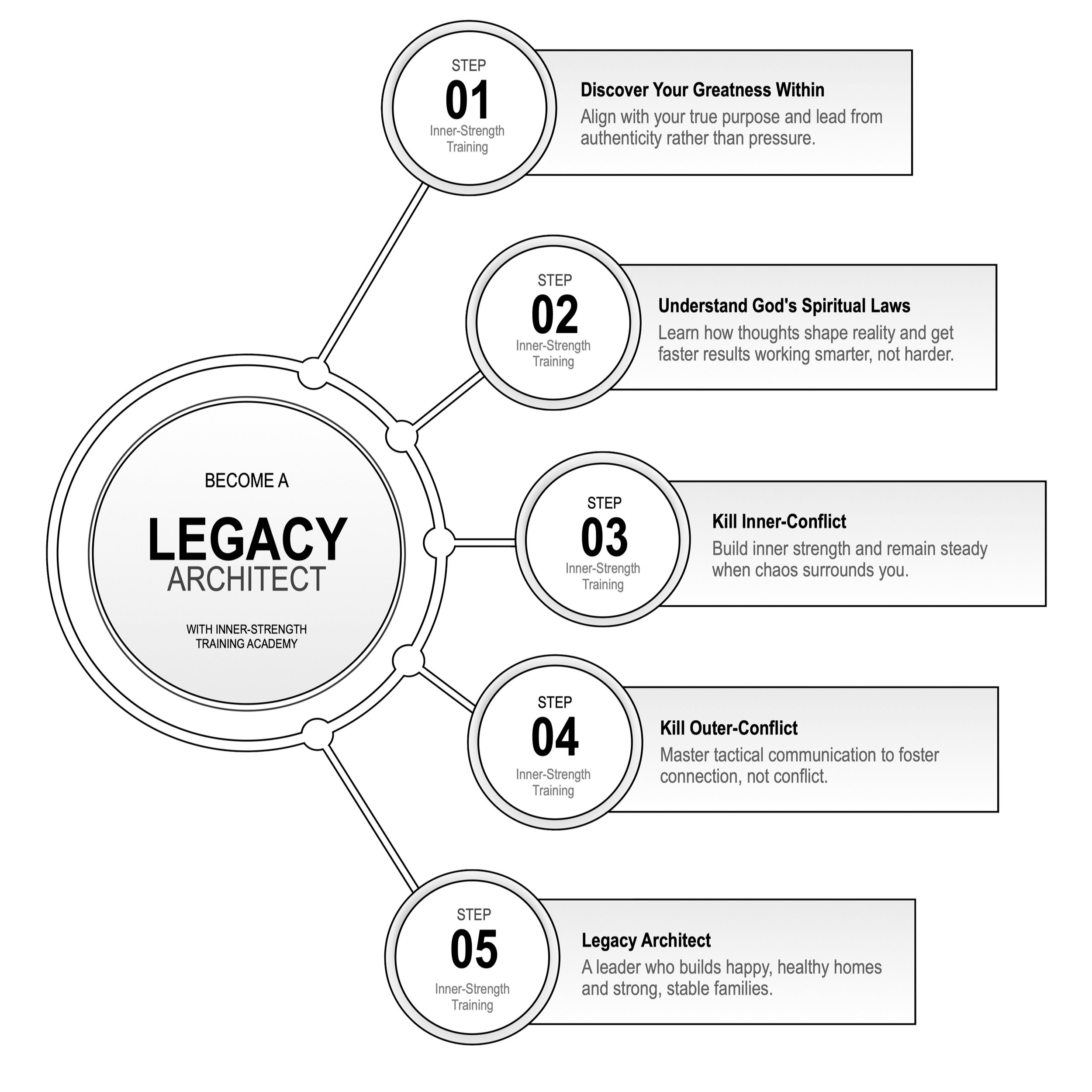 Introducing the Legacy Architect Program. Your roadmap to developing inner strength, fostering meaningful connections, and creating a lasting positive legacy within your family.